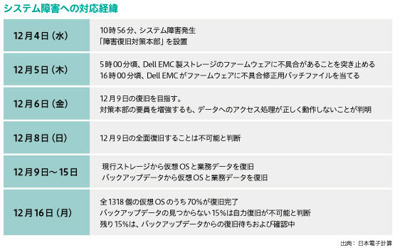JIPによれば、障害発生から12日目の12月16日の段階で、システムの70%が復旧、15%が復旧の見込みありで、残り15%が復旧できるかどうか分からない状態。原因は、Dell EMC製のストレージを制御するファームウェアの不具合。サーバーからストレージに接続できなくなったことで一部システムが停止した。JIPは不具合を修正するパッチファイルをDell EMCから入手し、ストレージの動作は正常に戻ったが、一部データに不整合が発生し、バックアップ先から完全な復旧はできなかったという。