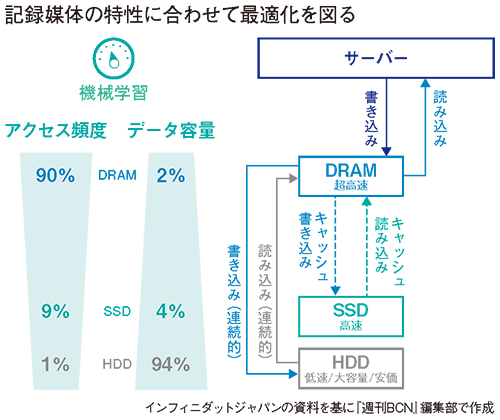 インフィニダットジャパンでは、ハードディスクドライブ(HDD)を多用することで容量あたりのコストを抑え、これにアクセスを担うDRAM、高速アクセスを担うSSDを組み合わせて十分な記録速度を実現。増え続ける重要データを、安く、安全に、快適さを損なわない速度で保管したいというニーズに応えている。