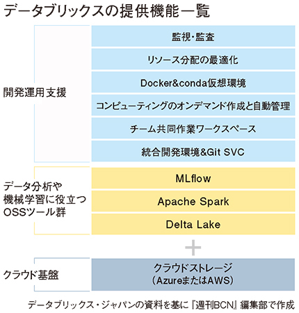 同社の特徴は、分散処理によって膨大なデータを高速分析できる「Apache Spark」や、次世代データウェアハウス/データレイクの「Delta Lake」、機械学習のライフサイクル管理の「MLflow」といったデータ分析や、機械学習の分野で最先端をいくOSSツールを中核に据え、これらツールを使いこなすための統合データ分析基盤を独自に開発している点にある(図参照)。