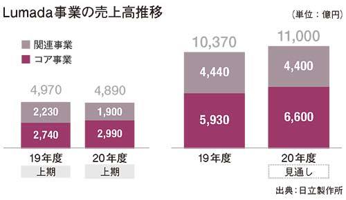 デジタル変革ビジネスの戦略商材「Lumada」事業の売上高は、前年同期比1.6%減の4890億円。うちLumadaの中核商材を指すコア事業は9.1%増の2990億円と堅調に推移するものの、中核商材を応用した関連事業は同14.8%減の1900億円となった。これはLumadaの応用先である「鉄道事業や建設機械の事業環境が悪化している」(河村専務)ことが影響した。Lumada事業全体の通期(21年3月期)の見通しは前年度比6%増の1兆1000億円を見込む。コア事業の伸びが牽引する一方、関連事業は横ばいと見ている(図参照)。