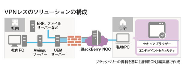 今回採用したブラックベリーのDigital Workplaceでは、端末上にデータを残さないセキュアブラウザーの「BlackBerry Access」と、エンドポイントセキュリティソフト「BlackBerry Protect」を、従業員が自宅などで使用するPC(私物可)に導入し、会社側には外部からのアクセスを受け付けるUEMサーバー、社内PCのデスクトップを転送するAwinguサーバーを用意する(図参照)。