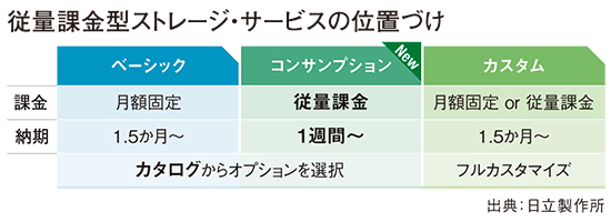 日立製作所は、客先に設置するオンプレミス方式のストレージで、メガクラウドベンダーが提供するストレージサービスと同等のコストパフォーマンスを意識した従量課金サービスを始めた。クラウドサービスの浸透で「使った分だけ支払う」従量課金や、「発注してすぐに使える」利便性が支持される中、日立製作所は発注から最短1週間で客先にストレージを届けるクラウド的なコンサンプション型のサービスを今回、初めて投入。価格を抑えて、広くビジネスパートナーに販売してもらい、従来のストレージ製品よりも“販売ボリューム”を大きくすることで利益増を目指す。(安藤章司)