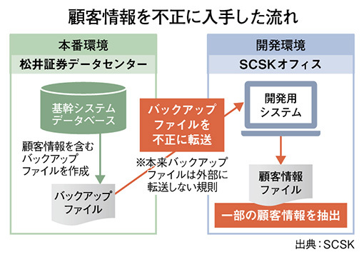 松井証券の基幹システムのバックアップは、運用を受託しているSCSK側の通常の業務として松井証券のシステム担当者の了承を得て定期的に行っている。本番システムに何らかの障害が発生したときにSCSK側からリモートでログを参照するなどの保守作業を行うため、本番環境とSCSK側の開発環境はネットワークで結ばれており、「このネットワークを悪用するかたちでバックアップを不正に転送した」(本件調査チームを担当したSCSKの福永哲弥取締役専務)という。