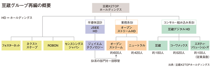 もう一つの中間持ち株会社のオープンストリームHDは、流通・小売業向けのシステム開発に強いオープンストリームと生産管理パッケージソフトなどを手がけるニュートラルを傘下に置く。半導体設計の事業会社ジェイエムテクノロジーからクラウドやIT基盤系の技術者約160人をオープンストリームに移管したことから、この2社を合計した従業員数は1000人以上に増えている(図参照)。事業会社のオープンストリームは首都圏の流通・小売業に強く、ニュートラルは東海地区の製造業を柱とする。ターゲット業種や商圏が異なることから「人材や技術の交流を通じて、新規顧客の開拓につなげていく」(オープンストリームHDの吉原和彦社長)と相乗効果を見込む。