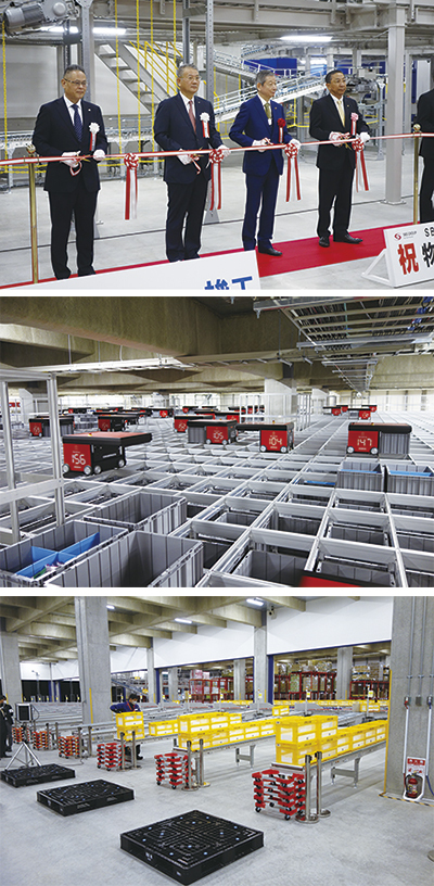 【写真下】配送方面別に梱包箱やコンテナを高速で自動仕分けする装置も備えた