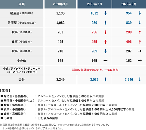 コロナ禍において営業時間が短くアルコールも出せない状況下で、居酒屋は苦戦を強いられた。補助金をもらったとしても存続が難しい店舗については閉店が続き、アルコールなしでも成立する食事を中心とした業態への転換が進んでいることが伺える。ランチ帯まで営業時間を延ばしたほか、定食メニューを充実させて食事メインでアルコールも楽しめるというハイブリッド的な店舗も増えている。