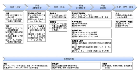 環境省「すべての企業が持続的に発展するために-持続可能な開発目標(SDGs)活用ガイド-資料編第2版」では、営業・製造・販売などの業務部門の職能別のプロセスではなく、企業経営としてのプロセスとプロセスにひも付く価値発生タイミングで項目が記述されている。勉強会では、この項目ごとにどのようなSDGsと対応する行動がつながっているかの事例を参考にして、自社の場合の現状と今後したい行動を話し合って決めていく。