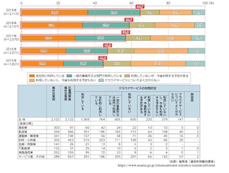 総務省によるコロナ禍前の2019年の調査では、64.7%の企業がクラウドサービスを利用していると答えており、年々右肩上がりでクラウドサービスの利用が増えている。