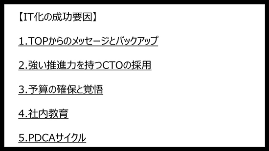 IT化は、すぐに結果の出るものではない。また、根付かせることが非常に大事である。根気をもって、あきらめずに、プロジェクトチーム一丸となって、取り組んでもらいたい。