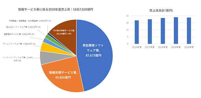 日本のSIビジネスは、大きな市場規模を誇っている。経済産業省の「2021年情報通信業基本調査(2020年度実績)」によれば、SIビジネスが属する情報サービス産業の市場規模は、2020年度売上高で18兆7928億円となっている。自動車・鉄鋼・エレクトロニクスなど日本の他の基幹産業と比べても遜色のない規模だ。このうち、受託開発ソフトウェア業と情報処理サービス業で約71%を占める。売上高の推移は16年度から19年度まで微増してきたが、20年度は前年度比1.1%減となった。デジタル活用が競争力の源泉となる昨今、DXブームや自治体のデジタル化などの需要から、この規模は維持されていくだろう。