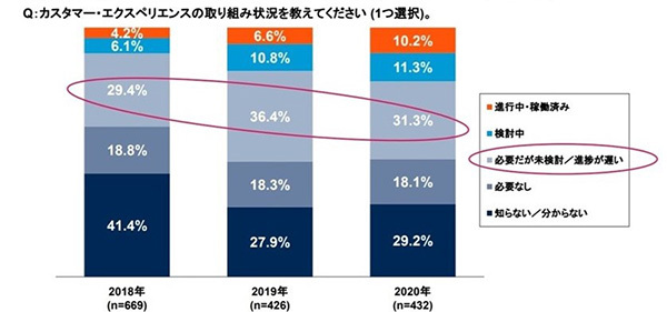 ガートナージャパンによると、2020年の国内企業におけるCXプロジェクトの取り組み状況は「必要だが未検討/進捗が遅い」と回答した割合が2割強、「必要なし」「知らない/分からない」も含めると8割弱である。