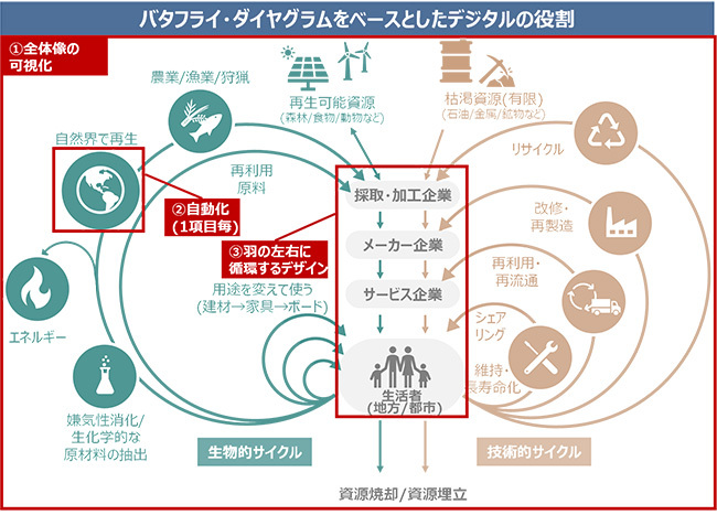 デジタルの役割は、ハードたるアセット・コンポーネントのコネクト高度化およびプロセスの精緻化、その上でソフトたる人の行動の適正化、の総合芸術といえる。具体的には、(1)製品や素材など再利用品で構成していることを可視化し、数字で把握することにより、社会貢献している実感を高める、(2)生ごみ回収・堆肥化を自動化し農地還元することにより、人手不足を解消する、(3)製品や素材を長く使い続ける業界標準や製品設計、生活者同士が相互に再利用を促せるサービスにより、資源循環行動に導く――の3点だ。