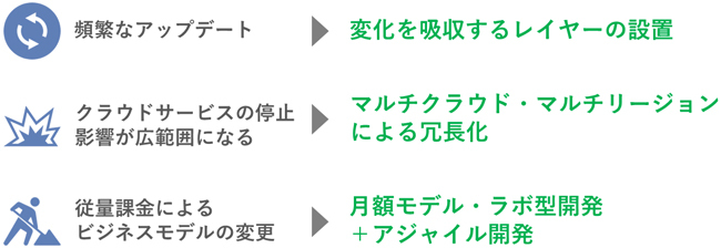 3番目は、従量課金によりビジネスモデルを変更する必要があること。システム利用企業は、以前であればシステム開発に大きく初期投資してきた。現在はビジネスの成長に応じて変動費として扱う必要がある。SIビジネスを展開する企業も、それに合わせてビジネスモデルを変更しなければならない。
