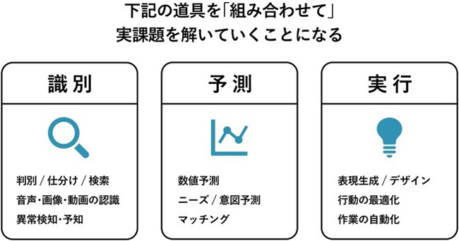 ということで、AIモデルを成功させるためには、AIを活用する分野と、人の判断に委ねる分野を明確に分けて、モデル設計していく必要がある。では、AIに任せる分野では、AIは何ができるのか。それは、「識別」と「予測」と「実行」である。これらの道具を組み合わせて、実課題を解いていくことになる。そして、AIが苦手な部分は人が判断をしてカバーしていくのである。