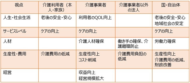 最初に、介護DXの目的を、(1)介護利用者(ケアを受ける人やその家族)、(2)介護事業者、(3)介護事業者以外の法人、(4)国・自治体、それぞれの立場から整理した。一般的にDXは経営や事業の改革を目的とすることが多いが、介護の場合は「老後の安全・安心」や「人材・労働力」「財政」など幅広いテーマにつながっている。だからこそ国も手厚い推進策を行っている。