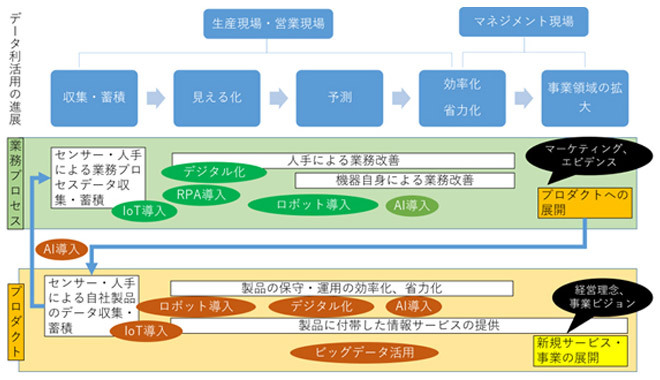 データの利活用は、「データの収集・蓄積」「データ分析による見える化」「データ分析による予測(業績・実績・在庫管理など)」「データ分析の結果を活用した効率化」「データ分析の結果に基づく事業領域の拡大」と進展するため、何のどのようなデータを収集するかを見定められない場合、IoT活用は失敗しがちだ。
