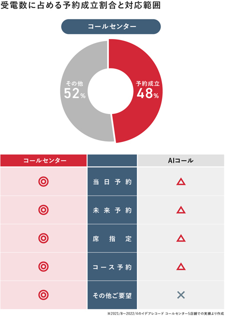 コールセンターでは、配席ディレクションによって予約成立が約50%というデータがある。残りの半分は、何かしらの理由によって予約が成立しなかったほか、既存予約の変更、その他の問い合せとなる。一方、AIコールはどんな時間帯でも対応できるが、処理できる業務には限りがある。また「明日」や「あさって」などの言葉の認識や判定が正しくされず、結果的にエラーが重なり店舗にエスカレーションされてしまうこともある。