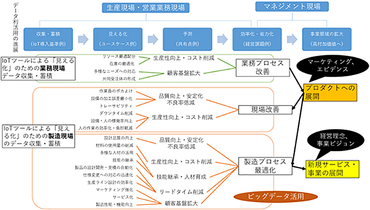 というのも、ユースケースの選択によって、IoTから取得したいデータのある現場が異なってくるためである。例えば、(1)生産現場における課題を解決するためのツール、(2)工場や企業の外と情報をやり取りする際の課題を解決するためのツール、(3)事務における課題解決ツール、(4)グローバル化にともない海外で展開するために役立つツール、(5)自社製品をIoT化するためのツール、(6)データの活用全般に関わるツール、(7)人材育成の観点で活用できるツールなど。したがって、どのユースケースに関連するIoTツール導入を優先するかによって、高付加価値へのロードマップも変わってくる。