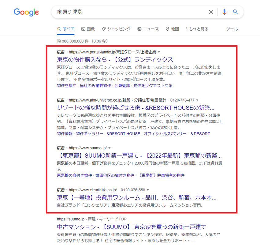 通常の広告のやり方だと、リスティング広告(検索連動型広告)を利用することだ。「家 買う 東京」のような検索に対してのアプローチだ。