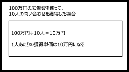 例えば、100万円の広告費を使って、10人の問い合わせを獲得した場合、1人当たりの問い合わせを獲得するために10万円を使ったことになる。問い合わせた顧客を育てていくことは10万円を有効に活用できているかともいえる。意外と問い合わせを取って終わりという会社も多く見られる。