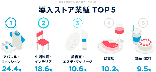 STORES レジは、アパレルや生活雑貨、食品などの「小売業」が全体の6割を占めつつ、