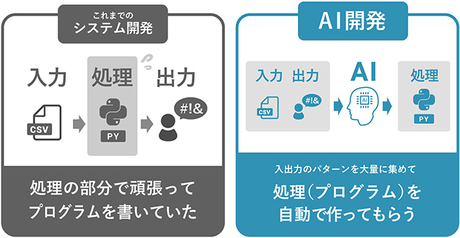 従来型のシステム開発は、入力データを処理するブログラムを書いて、期待する出力結果が得られる仕組みになっている。例えば、「A」を入力して、「B」を追加するプログラムであれば、「A+B」という結果が返されるという具合だ。エンジニアはこのプログラムを書くことに専念している。