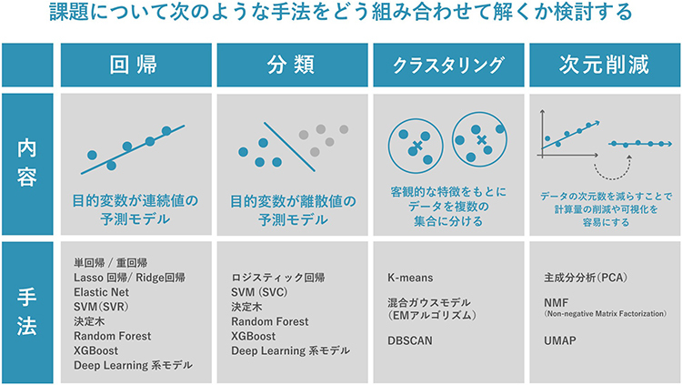 この「識別」「予測」「実行」の各タスクは、アルゴリズムを使って実現することができる。機械学習ではさまざまなアルゴリズムが提供されており、目的に応じて使い分けられている。「回帰」「分類」「クラスタリング」「次元削減」などである。また、有名なディープラーニングも機械学習の中のアルゴリズムの一つである。
