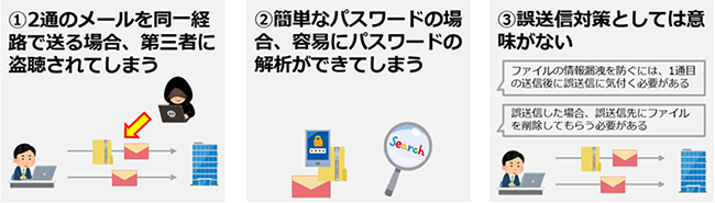 続いて、メール送信の代表的なリスクとしては、(1)2通のメールを同一経路で送る場合、第三者に盗聴されてしまう、(2)簡単なパスワードの場合、容易にパスワードの解析ができてしまう、(3)誤送信対策としては意味がない――などが挙げられる。そもそもパスワード付きZIPファイルの送受信には、手間も時間もかかるという課題もある。