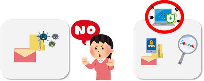 まず、メールの受信においては、パスワード付きZIPファイルの中身をチェックできない場合、(1)パスワード付きZIPファイルを受け取らない、(2)パスワード付きZIPファイルの中身をチェックできる製品を導入する――といった対策を行うことが重要である。