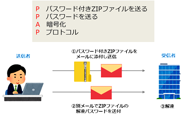 昨今、話題となっているPPAPは、パスワード付きZIPファイルを送信し、その後パスワードを別送するメール送信手法である。PPAPはこれまで情報漏洩を防ぐためのセキュリティ対策として省庁・企業を問わず広く活用されてきたが、セキュリティリスクが指摘され、PPAPの利用は問題視されている。