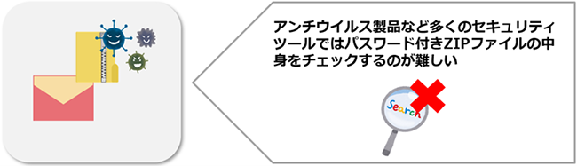 PPAPのセキュリティリスクは、メールの受信と送信それぞれにある。まず、メール受信での大きなリスクは、ファイルの中身をチェックできず、マルウェア対策が行えないことにある。そのため、Emotetなどのメール攻撃にPPAPが悪用されることがあった。アンチウイルス製品など多くのセキュリティツールではパスワード付きZIPファイルの中身をチェックできないケースが多いため、ZIPファイルを開いた瞬間に感染したというケースも発生している。