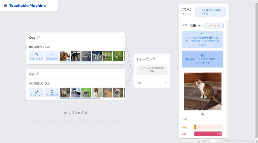 例えば、Googleが提供するTeachable Machineを使えば画像認識のモデルは誰でもあっという間にできる。モデルができたら、また別の画像を準備してもらって実際に分類できるか試してみる。正しく認識できるかどうかは、選んだ題材と準備したデータ次第だ。その、「題材とデータ次第」というのがAIを理解する上では重要なのである。