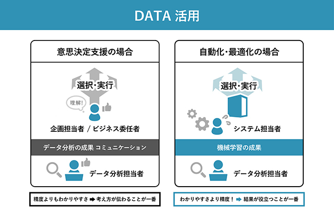 ここで重要な要素がある。それは「人の判断を支援するAIモデルをつくるのか」、もしくは「コンピュータに自動で判断させるためのAIモデルをつくるのか」ということである。言い換えれば、「人間を補助する道具なのか」、「完全自動化できれば良いのか」といえる。AIモデルを利用する上で大事な要素して、「分かりやすさ」というものがある。特にPDCAを回す際は共感がないと難しい。一方、「精度が大事であり中はブラックボックスで良い」という意見もある。これは「統計学」と「機械学習」の違いということもできる。