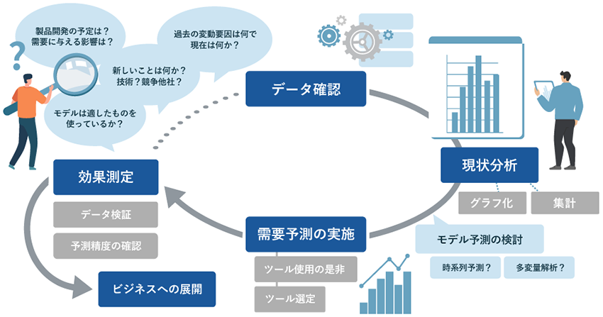 このようなニーズに対して、いきなり全てを自動化しようと考えると理由が分からなくなる。ではどうするのか。問題を複数のプロセスに分解して取り組んでいくことが重要だ。まず初めに、将来の製品需要について予測する。そして、その需要予測であれば最適な生産計画はこのようになるだろう。さらに、この生産計画であれば倉庫における配置と輸送はこうなるだろうという、という具合だ。