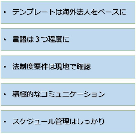 少なくとも日本国内用と海外用のテンプレートは分けるべきで、海外用テンプレートは例えばタイやシンガポールのような比較的小規模で法制度の要求が少ない国の現地法人で構築すべきである。テンプレートは最小限のものにしておいた方が、後にスムーズに展開しやすい。
