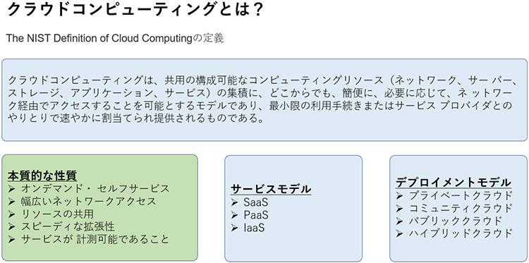 クラウドの本質は、NIST(National Institute of Standards and Technology、米国標準技術研究所)が提唱する「The NIST Definition of Cloud Computing」に記載されている。