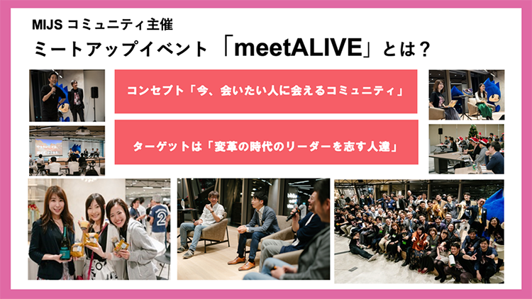 筆者は、「meetALIVE(ミートアライブ)」という出会いと学びのプラットフォームのプロデューサーをしている。meetALIVEとは「変革のリーダー」を対象としたミートアップイベントであり、変化に敏感で、”考動”できる人たちに刺激を与え、多くの人がこれをきっかけにつながり、明日の日本や社会の“あるべき姿”の実現に向けて寄与することを目的に活動している。