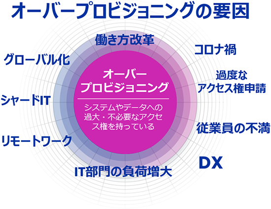 従来からオーバープロビジョニングは少なからず発生していたが、コロナ禍によるリモートワークの急激な拡大により増加したと考えられる。企業・組織は感染防止の観点から会社での業務を避け、リモートワークを増やさなければいけない状況に追い込まれた。VPNやリモートアクセス環境を準備するだけで手いっぱいのIT部門では、利用者に対して細かく権限を割り当てる余裕がなく、アクセスできるようにすることを優先して大きめに権限を割り当てたり、リモートワークを行う社員にすべて同じ権限を割り当てたりした。リモートワーク環境の整備を短期間に行うためには仕方のない対応だったといえるが、結果的にオーバープロビジョニングとなり、コンプライアンスやセキュリティ上の課題が残された。