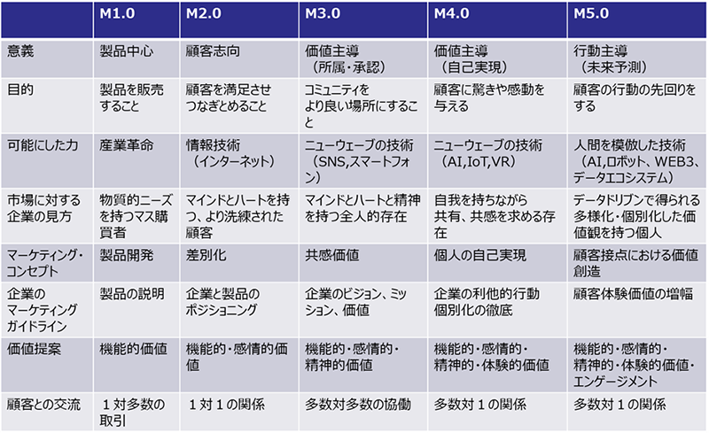 業界によっては、マーケティング1.0から変わらないことが望ましいものもあるので、全ての企業がマーケティング5.0を目指す必要があるわけではないということを忘れてはならない。マーケティング3.0以降は製品から価値に主眼が移ってくるため、マーケティングに求められるのは共感である。