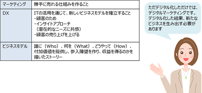 勝手に売れる仕組みであるマーケティングに対して、新たなビジネスモデルが確立できるようにトランスフォーメーションしていくにはどうしたら良いだろうか。勝手に売れる仕組みというのは、既存のものも販路拡大なので、どれもDXとは呼べないと感じるかもしれない。しかし、市場調査や商品開発、広告宣伝、効果検証といったマーケティングプロセスをITツールやAIを導入してデジタル化し、さまざまなデジタルデータをクロスさせ、新しい製品・サービスや顧客の体験価値を変えることができればDXと呼べる。