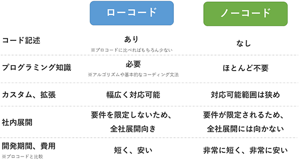もちろん、情報システム部などの開発経験のある人材であれば、難易度の高いローコードを使用し複雑な要件を実現することが可能だ。だが、同じ難易度のローコードであってもこれまでにコーディング経験のない人材が取り組む場合、かなりの学習コストを要することになる。そのため、単純に「ローコードでいこう!」というのではなく、慎重に検討することが重要だ。