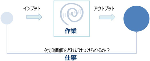 では、どうやって現場の人にシステム導入を意識してもらえば良いのだろうか。そのためには現場の人々に自身の業務内容を仕事と作業に分けてもらう。仕事と作業の違いとは何だろうか。付加価値を生み出すのが「仕事」であり、業務プロセスを進めるのが「作業」である。