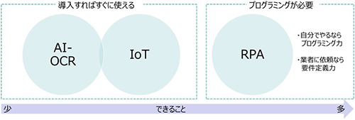 BPRを行う際に使える技術は、IoTやAI-OCR、RPAが挙げられる。IoTやAI-OCRは導入すればすぐに使えるので手軽に始められる。RPAはPythonやUipathなどのツールを用いてプログラムを書く必要があるので、なかなかハードルが高いかもしれない。しかし、反復性のある業務などは行っていけるようにデジタル化していくと良い。