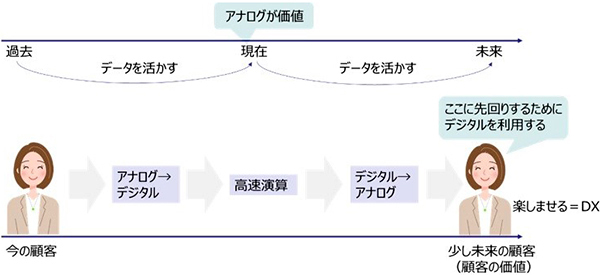 また、DXを起こすにあたっては、デジタルの視点も忘れてはならない。どのように、デジタル技術を活用していくと良いだろうか。人間はアナログの世界で生きているので、時系列で考えたときに、現在いる顧客に価値をもたせようとするとアナログ的価値を強固にした方が優位である。ハイクオリティな接客のホテルをイメージすると分かりやすいだろう。アナログ的価値を細部まで行き渡らせることで価値を高める。だからこそ、現在の顧客に価値を生むのは人間がアナログで行う方が良い。