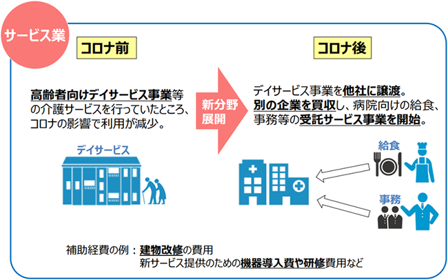 2020年度に新設された、事業再構築補助金でも必要なのは、モジュラーシンキングである。現存の自社のビジネスを分解し、強みをもとに現状の事業とは別軸で立てるように再構築することが求められている。例えば、高齢者向けデイサービス事業をしていた事業者が経営という強みをもとに企業買収し、病院向けの給食や事務を請け負う新たなビジネスを構築したり、紳士服販売を営んでいた事業者が紳士服への理解という強みをもとにネット販売やレンタル事業を開始し、新たな販路を構築したりしている。