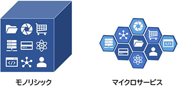 モノリシックなアプリケーションとマイクロサービスのイメージ