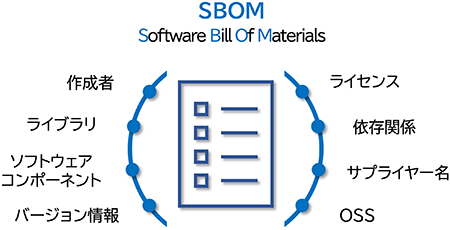 こういった問題に対処する方法が、「SBOM(ソフトウェアの部品表)」である。SBOMはソフトウェアの部品表なので、ソフトウェアに含まれるOSS・コンポーネントなどの出所やライセンス・バージョン情報・セキュリティ属性といった関連情報を管理する。SBOMの活用によって、ソフトウェアに使用されている各部品(OSS・コンポーネントなど)が安全かどうかを判断できるようになるのである。