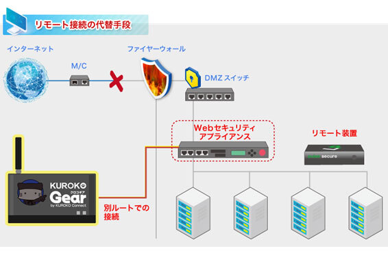 アクションは、通常のメンテナンス回線からできず、代替接続手段が必要になりました。そこで当社の製品である「KUROKO Connect」を使って、モバイル閉域網からメンテナンス作業時だけ別ルートでセキュリティ機器に接続できる状態にしたのです。