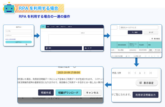 私のところに持ち込まれるのは、大体がコストをかけたくないとの話なので、キャリアにAPIをつくってもらうなどあり得ませんでした。次善の策としては、RPA(Robotic Process Automation)にブラウザを自動操作させて、画面からコピペでデータを抜き取る方法を考えました。