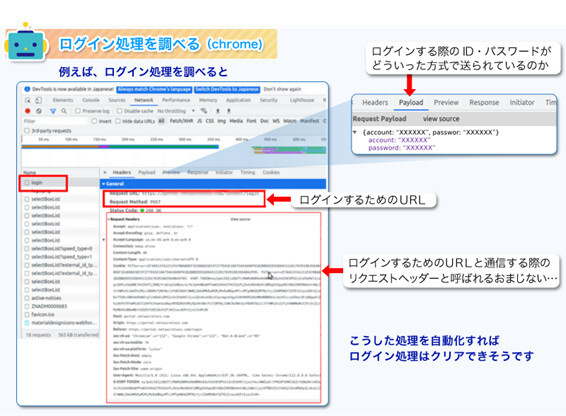 こう書くと簡単そうですが、Webシステムなので、セキュリティ対策を突破する必要がありました。例えば、ログインすると、端末を識別するためのトークン情報が送られてきます。ところが、トークン情報だけでは次以降の画面にアクセスできません。よくよく調べた結果、Cookieも渡す必要があると分かりました。
